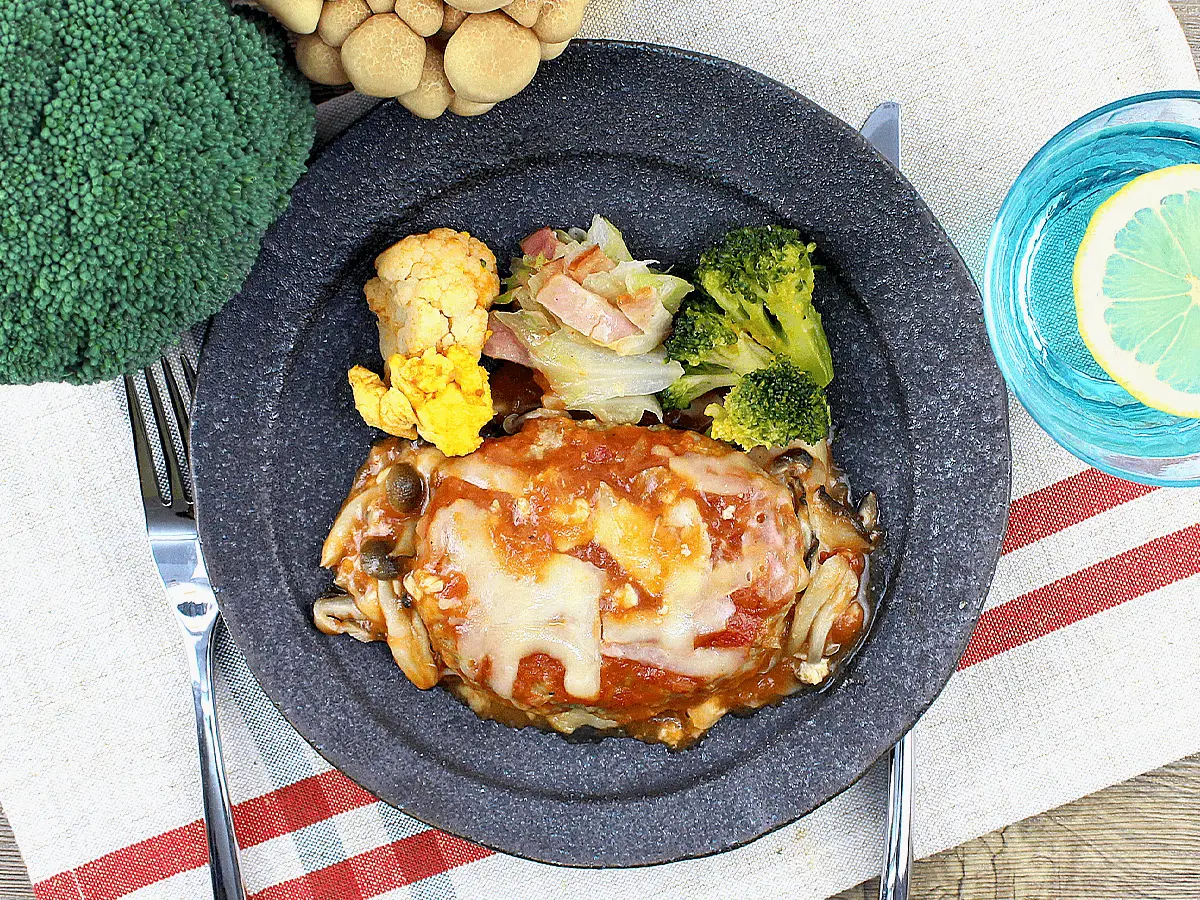 幅広い年齢層に愛され続けるトマトソースに、3種類のきのことチーズがトッピングされたハンバーグです。